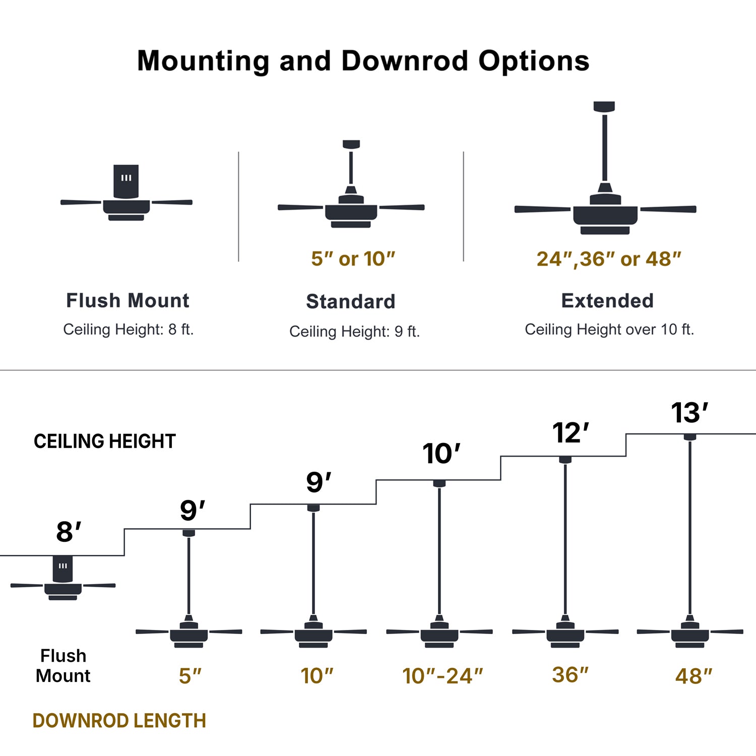 The choice of mount type depends on the ceiling height and slope of the room. For optimal airflow, a ceiling fan should be installed 7' to 9' above the floor. Most mounts are adjustable, allowing you to easily achieve the perfect height. Here are three available mount types for ceiling fans.
