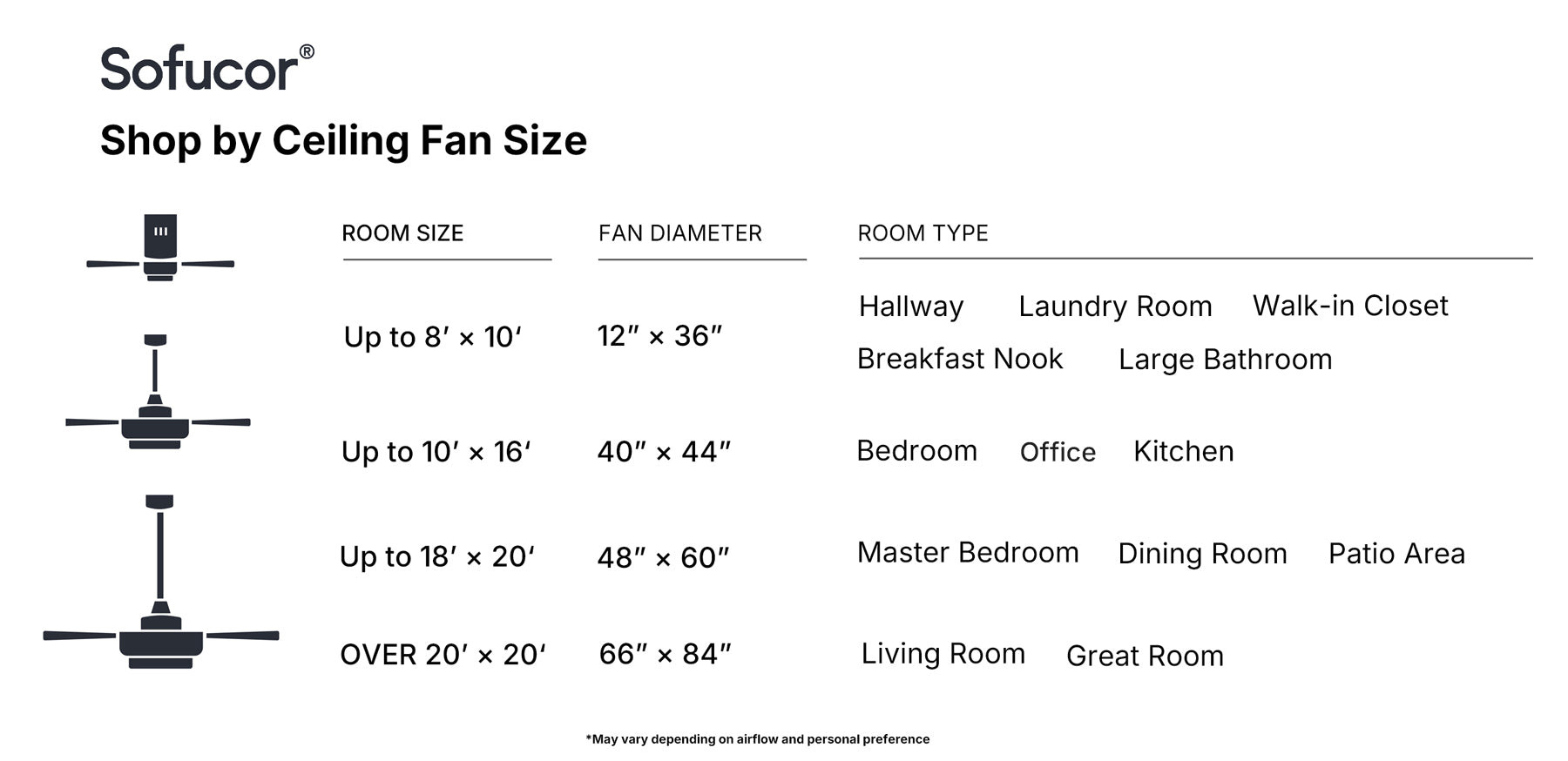 Want to learn what size ceiling fan to pick for rooms of various dimensions? While not all rooms are perfectly rectangular, this ceiling fan size guide can help you choose the right size fan for your room. It also shows you the types of rooms that generally fall within these dimensions.