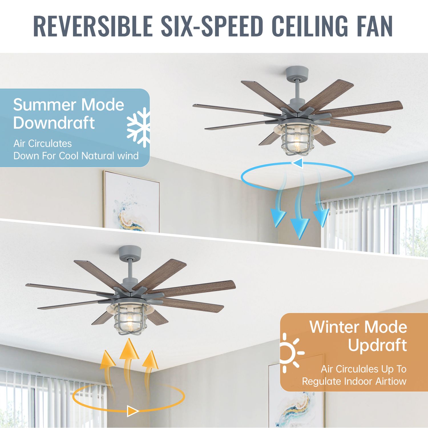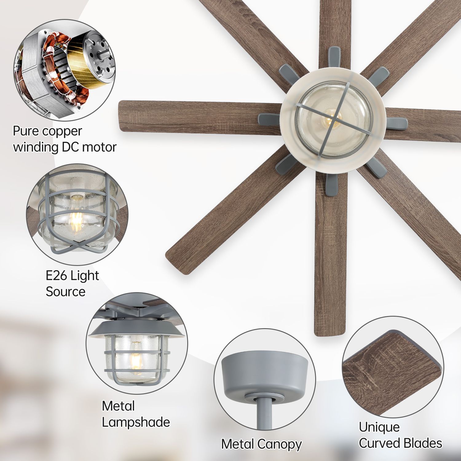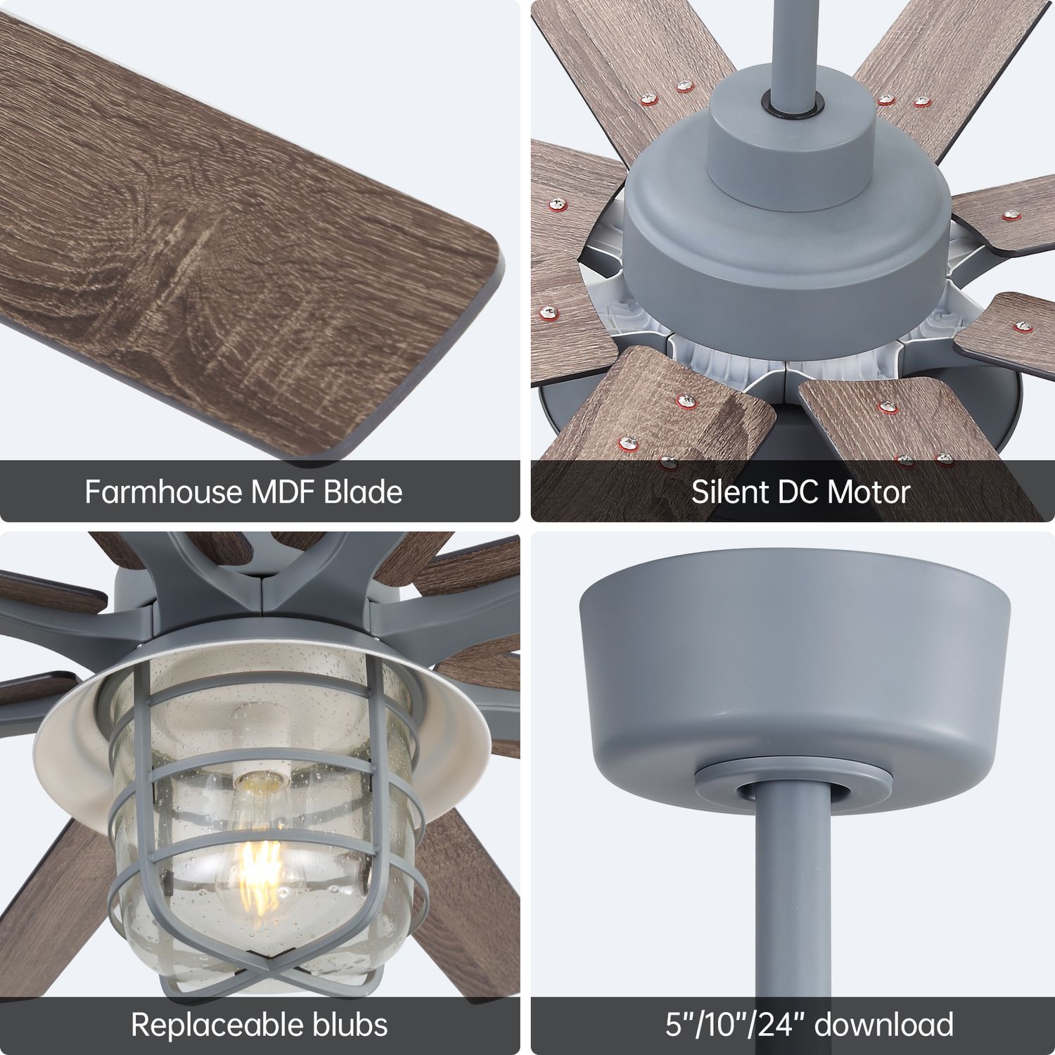 Sofucor 52" Ash Grey Ceiling Fan with Bubble Glass Light blends modern industrial style with whisper-quiet comfort.