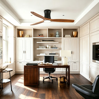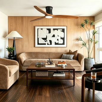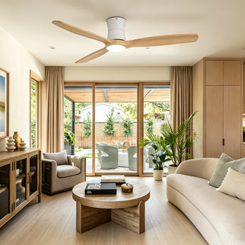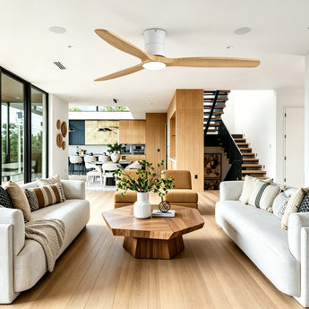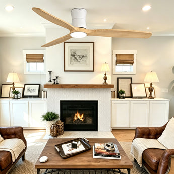 Natural wood-style blades with a refined wood finish, designed for balanced, smooth airflow, low noise operation, and a warm, timeless aesthetic.