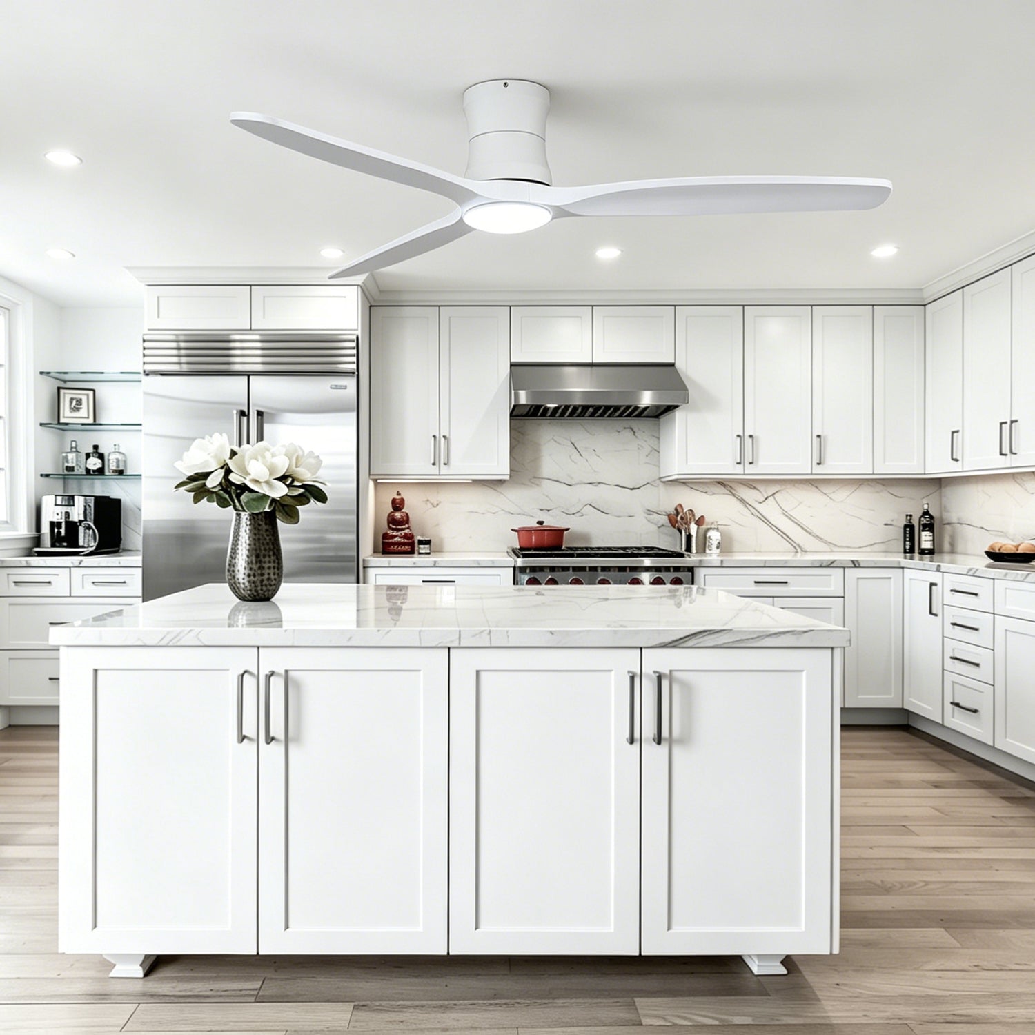 Sleek and space-saving, the low profile design sits close to the ceiling—perfect for rooms with lower ceilings while maintaining a clean, modern look and comfortable airflow.