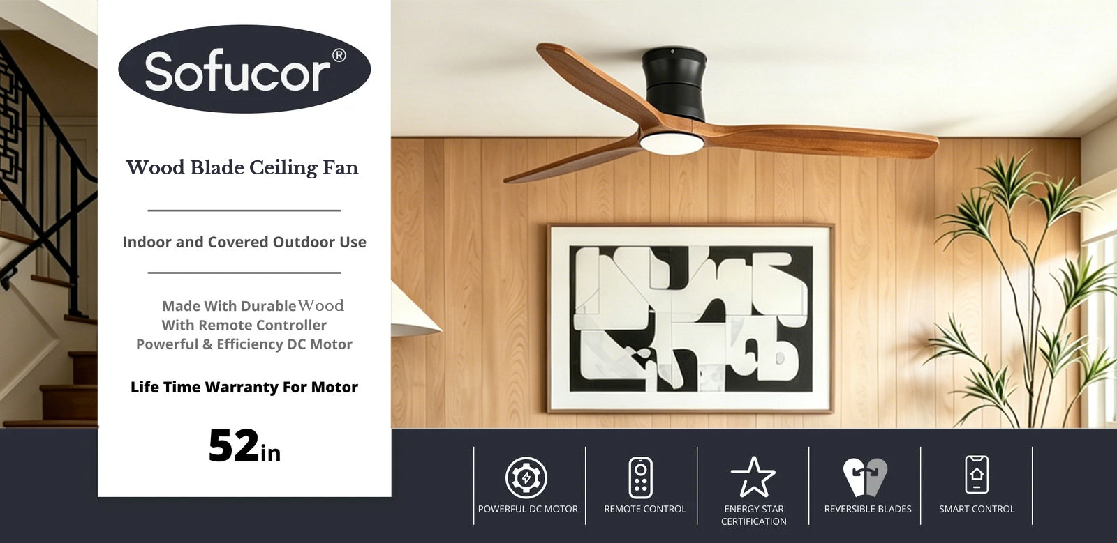 Elevate your space with the perfect blend of style, quiet operation, and smart functionality offered by the Sofucor 52-Inch DC Motor Ceiling Fan.